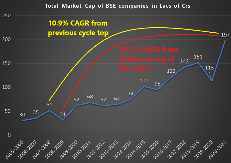 Let’s start with the total market cap of BSE companies (data available on BSE’s website). If we were to consider returns between peak market cap in the previous market cycle and today, the returns have been 16.7% CAGR, which is on the higher side. Conversely, from the previous top to the current top, the CAGR works out to 10.9% which isn’t a great return, considering risk-free interest rates during the same period.