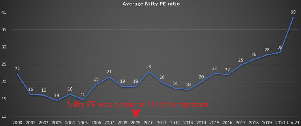 Nifty P/E, a widely tracked data point (or at least it used to be), is up from a low off 11 in 2009 to 39 in Jan 2021.