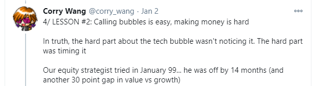 For those of you smarties, who’d like to time the crash, here’s what Cory Wang of Bernstein Research, noted recently after analyzing documents dated right before the dotcom bubble burst in 2000 – the hard part of a bubble is not noticing it. The hard part is timing it. You could be wrong for a while, before you may or may not be eventually right. And you could turn out to be right, for the wrong reasons.